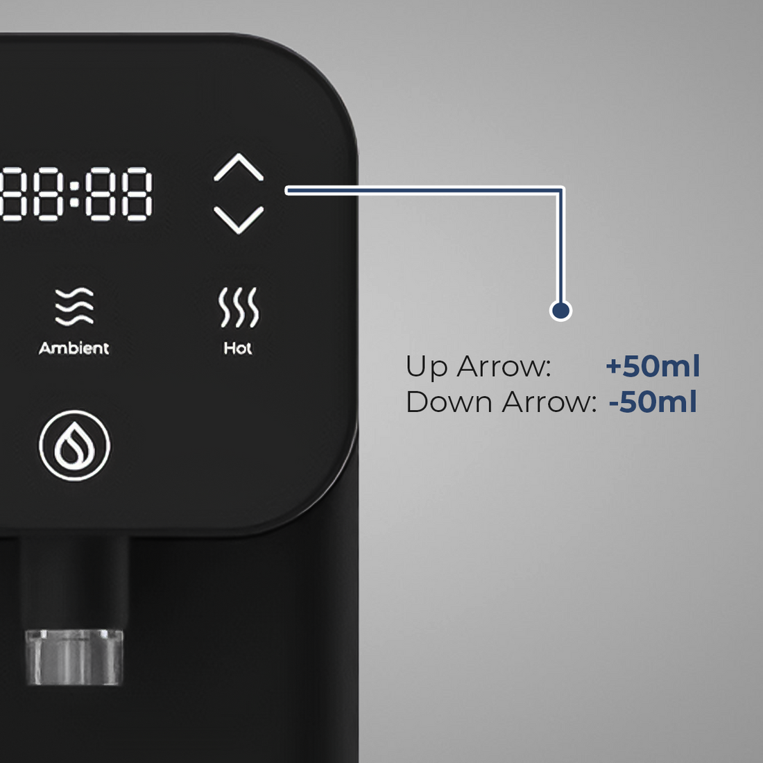 Customize your water volume to match your cup or bottle size. Each press of the up or down arrow button adjusts the volume by 50ml, giving you precise control without being limited to preset amounts.
