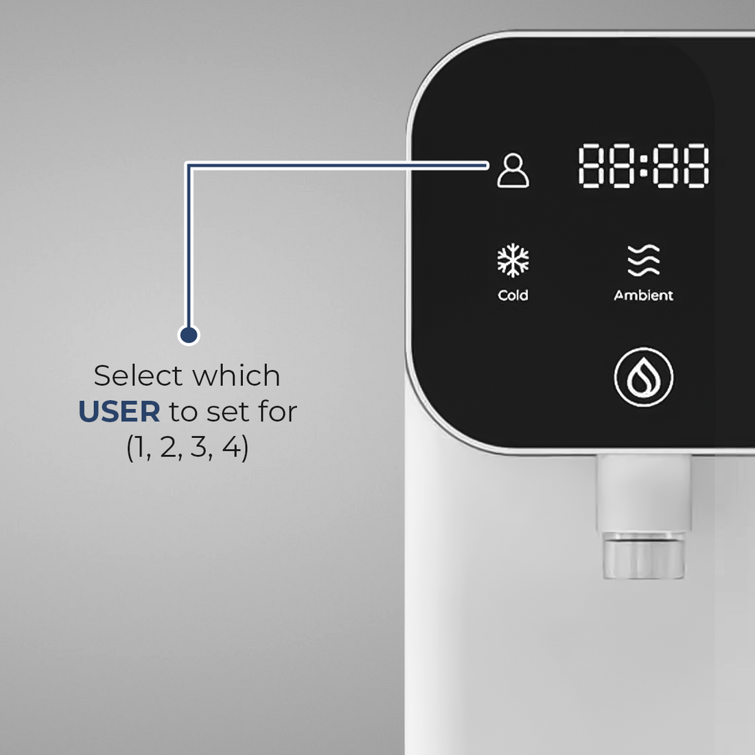 Now equipped with a display that clearly shows dispensed water volume, selected user memory profile, water temperature, and time.